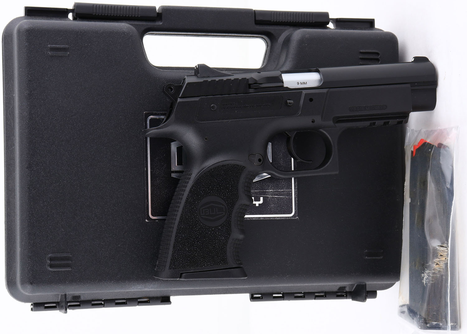 NEW CASED, BUL, Model Cherokee, CAL: 9mm, MFG: Modern, SN: CP-26188, Semi Auto pistol, 4 1/4'' barrel. The synthetic frame & stippled & finger grooved grip are excellent. The factory black finish rates 100% overall. Bore is mint excellent. Three white dot factory sights. Under frame picatinny rail for accessories & optics. Squared trigger guard. Double-action/single-action (DA/SA) system, with a safety lever. Comes in original factory box, with owners manual, additional 17 rd mag., brushes & cleaning rod. NOS. FFL Req. - Value: 500 to 650