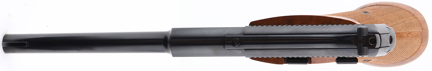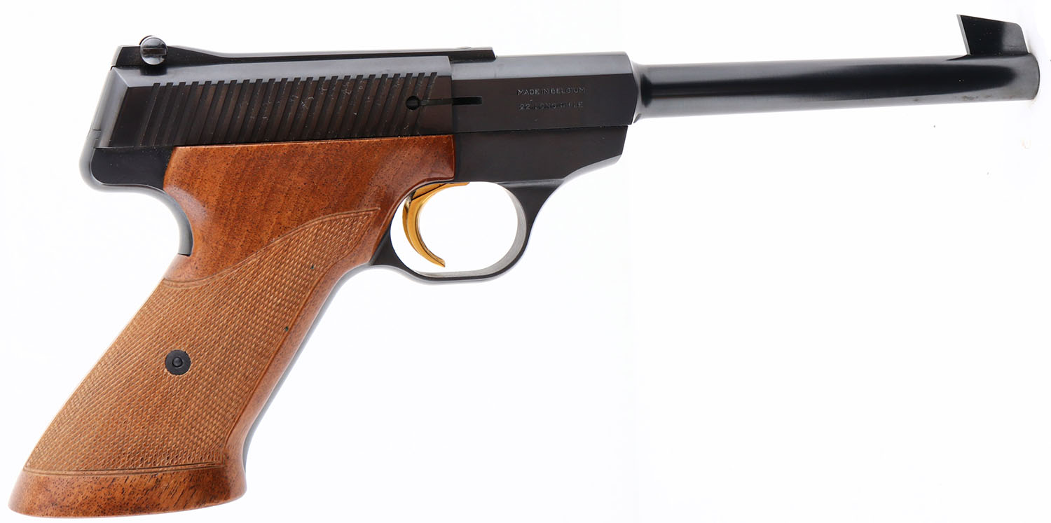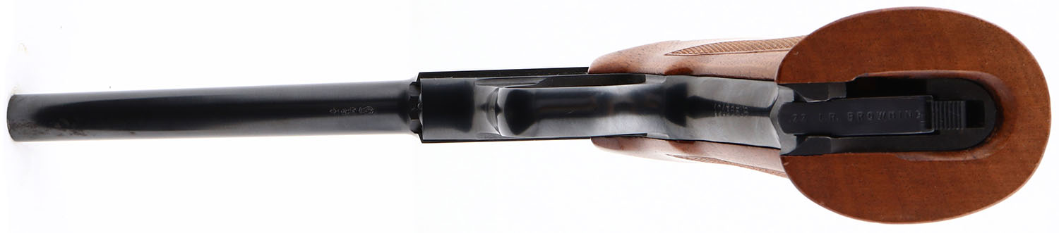 Browning, Model Challenger, Cal. 22 Long Rifle, Semi-Auto, Mfg. 1968, SN: 101365U8, 6 3/4'' barrel, One piece wood checkered grips are excellent, Metal blue finish is 99%, Bore is excellent, gold trigger, Detachable mag. FFL or C&R Req. - Value: 400 to 650