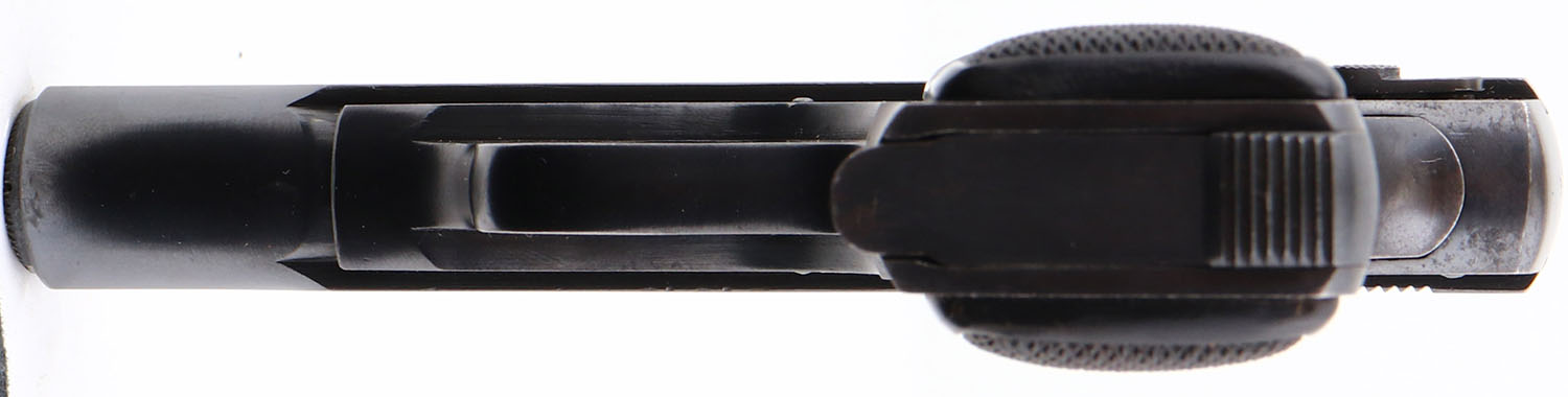 FN, M1910, CAL: 7.65 MM (.32 ACP), MFG: 1910's, SN: 81839, Semi-Auto Pistol, 3 3/8'' barrel. Made in Belgium. A blowback semi-automatic pistol designed by John Browning. Approximately 705,000 produced, mainly for the European market, WWI & WWII. The pistol incorporates the standard Browning striker-firing mechanism, a grip safety along with a magazine safety & an external safety lever (known as the ''triple safety'') in a compact package. The original checked grips are excellent with ''FN'' logo on top. The metal blue finish is 95%. There is a ground gouge in the frame above the trigger on the right side, which may have been the original or part of the original SN & possibly restamped. Bore is excellent & bright. Notch & fixed blade sights. Original FN marked 7 round mag. FFL or C&R Req. - Value: 600 to 1000