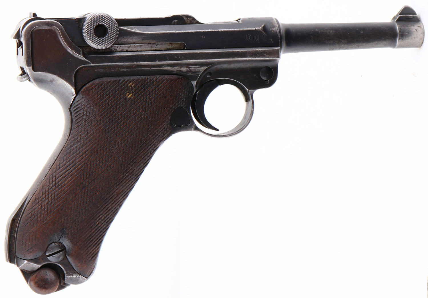 Mauser, Model P08 Lugar, Cal. 9mm, Semi-Auto, Mfg. 1935-39 German, SN: 8801, 3 7/8'' barrel, The original checkered wood grips are very good, with some smoothing of the checkering & a tiny corner chips at the bottom front & upper back of left grip. Metal blue finish is 65%. Stamped with SN ''8801'' on front of frame, ''1921'' on top of barrel, ''4253'' on side of barrel, ''71'' on a couple of smaller parts, ''S/42'' & ''01'' on toggle lock, & ''35'' on extractor. Has stock lug on backstrap. Bore is very good. Has wood magazine floorplate.. FFL or C&R Req. - Value: 800 to 1500