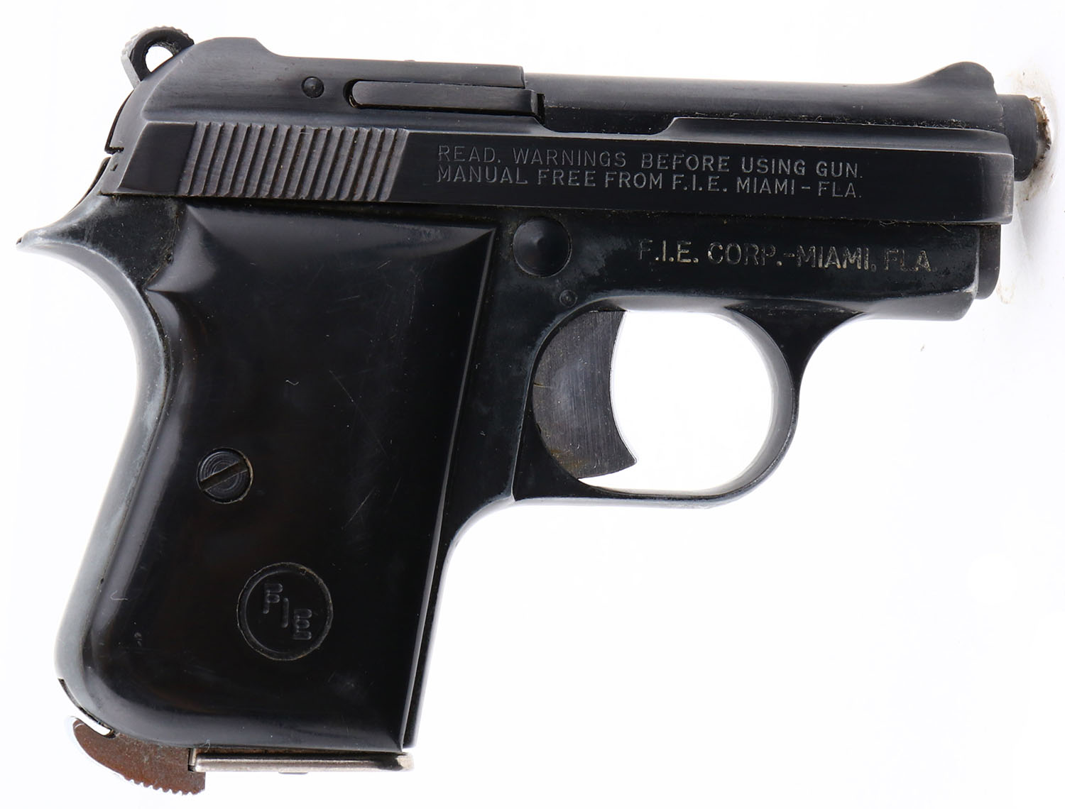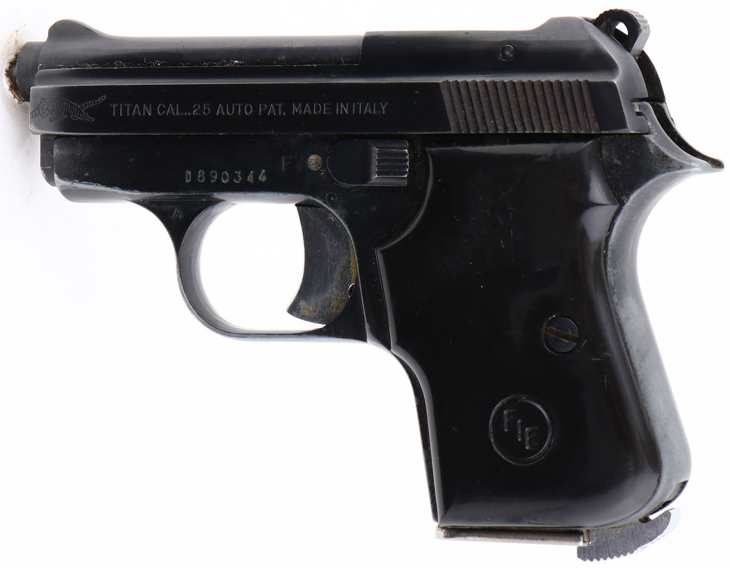 FIE Corp, Model Titan, CAL: .25 ACP, MFG: Modern, SN: I890344, Semi-Auto Pistol, 2.5'' barrel. Produced in Italy. The original smooth black plastic grips are very good, with minor scratches & rubs. The original black metal finish rates 80%. Bore is very good. Notch & blade sights. Detachable 6 rd mag. FFL Req. - Value: 100 to 200