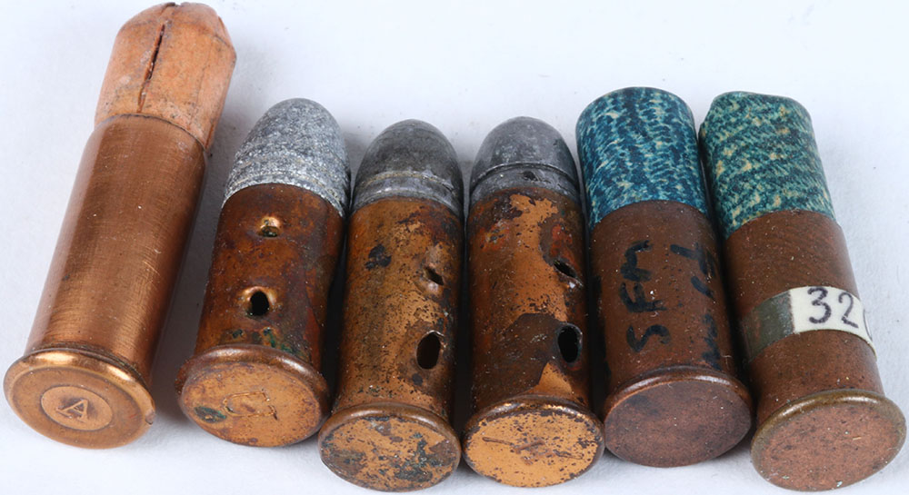 Lot of 6 R/F (1.) H/S= (IMP.) ''H'' 30 long R/F board dummy, 2-holes, wood rod, R.N.L. 1-GR. (1.) H/S= (IMP.) ''U'' 32 short R/F B.D. 2-CS. Holes, wood rod, R.N.L. 2-GR. (1.) H/S= (IMP.) ''H'', 323 long R/F B.D.2-CS. Holes, wood rod, R.N.L. 2-KN. (1.) H/S= (raised) ''A'' 32 long R/F shot load, COP. CS. Tan paper sabot (2.) N/H, 320 long R/F shot loads COP. CS. Blue/white paper sabot. Grade: Very Good + - Value: 20 to 50
