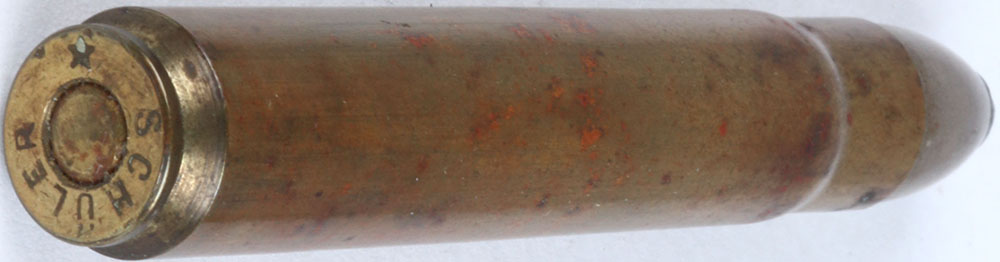 H/S= ''SCHULER *'' 11.2 x 72 rebated rim, flat brass primer, SP. TIN PTD. Grade: Very Good + - Value: 20 to 50
