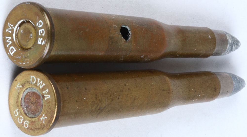 Lot of 2 VERY SCARCE H/S= ''K DWMK 536'' .22 high power oval COP. PRI., S.P. TIN PTD. H/S= ''K DWMK 536'', .22 high power display dummy, 1-CS. Hole, oval BR. PRI., S.P. TIN PTD. Grade: Very Good + - Value: 40 to 120