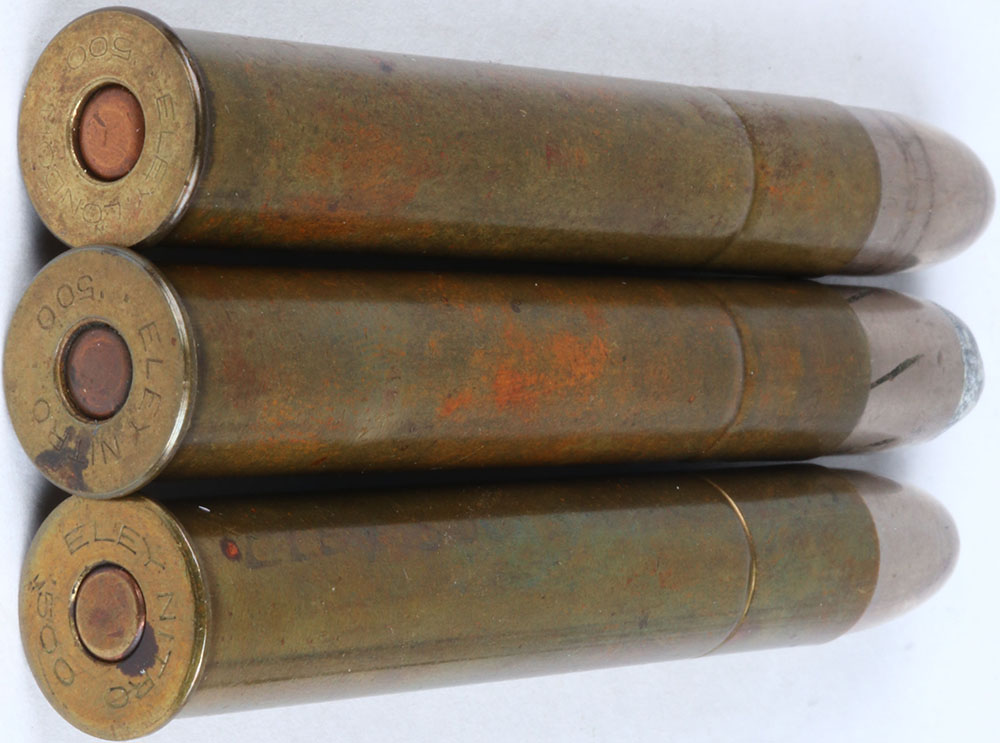 Lot of 3 Variations H/S= ''ELEY NITRO 500'' 3'' CL. (Fraser's Rachet bullet) oval copper primer, 1-CNN, SP. TIN RN. Rachet (1) H/S= ''ELEY LONDON 500'' 3'' CL. Oval copper primer 1-CNN, FP. TIN. RN. (1) H/S= ''ELEY NITRO 500'' flat brass primer 3'' CL., 1-CNN, FP. TIN RN. Grade: Excellent - Value: 30 to 100