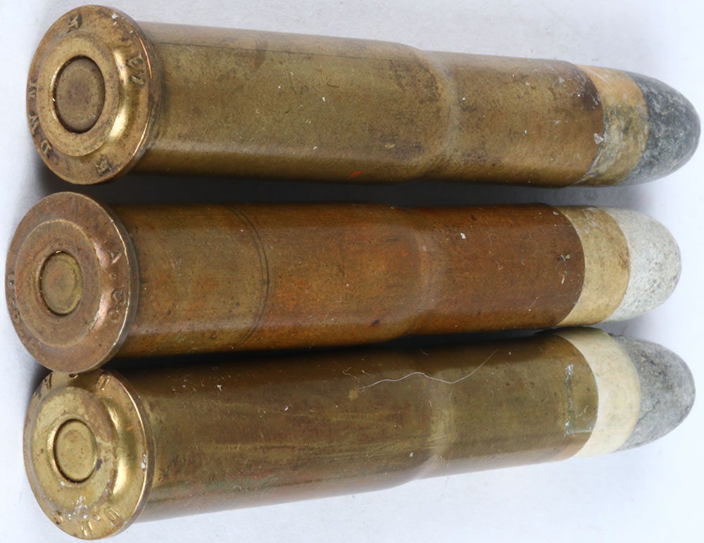 Lot of 3 SCARCE H/S's (1) H/S= (raised) ''DWM 41'' 11.15 x 60R Mauser, flat brass berdan primer, PP. FNL. (1) H/S= (raised) ''UMC USA'' 11.15 x 60R Mauser, oval brass primer PP. FNL. (1) H/S= (raised) ''WRA.Co. USA'' 11.15 x 60 R Mauser oval brass primer, PP. RNL. Grade: Excellent - Value: 40 to 70
