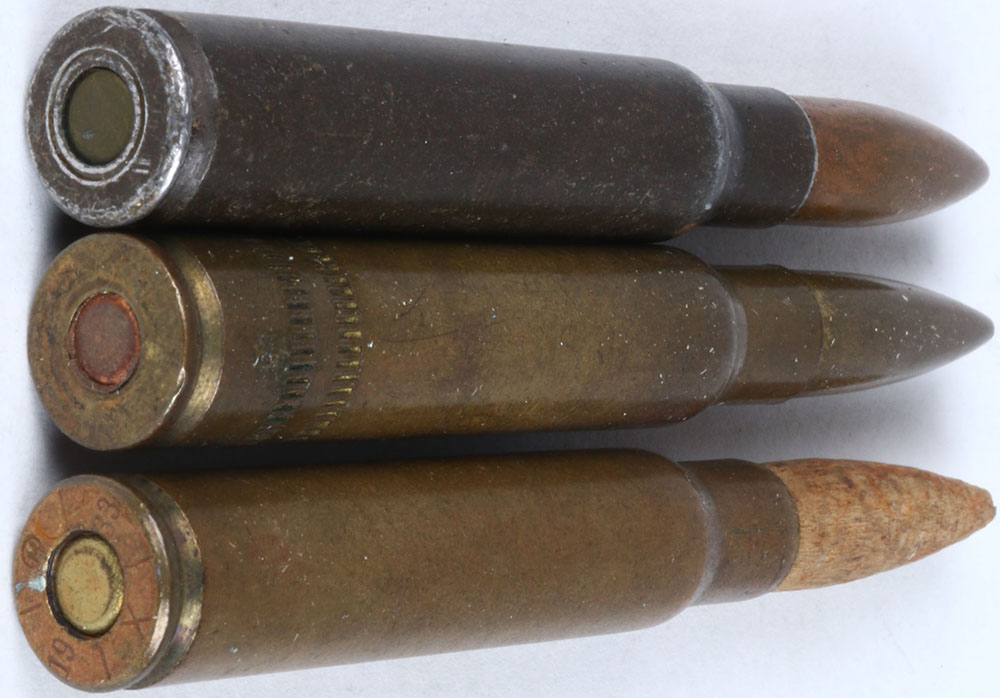 Lot of 3 SCARCE Variations (1) N/H 7.7 x 58 mm JAP., black steel case, oval brass primer, FP. GM. PTD. (1) H/S= ''x 1933 '' 7.7 x 58mm JAP. Blank, flat brass primer, PTD. Wood bullet (1) N/H 7.7 x 58 mm JAP. 2-Knurled case CNN., flat copper primer, FP. GM. PTD. All rimless Grade: Very Good ++ - Value: 20 to 50