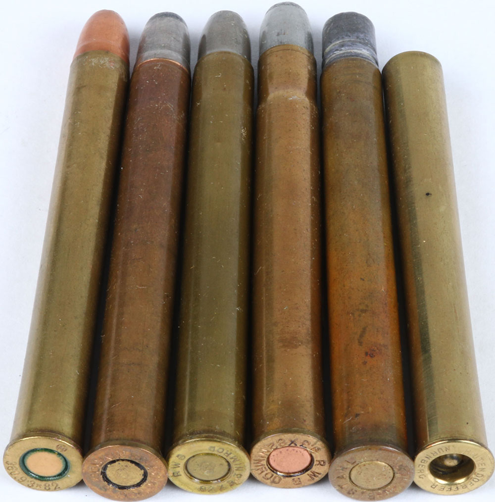Lot of 6 (1) H/S= ''B. STAHL'' 9.3 x 82 nimrod flat brass primer (black powder) FNL. 2-GR (1) H/S= ''R.W.S. 82 x 9.3 NIMROD'' flat brass primer (shield) SP. TIN FN. Belted (1) H/S= ''360 9.3 x 82'' (nimrod) flat brass primer, FP. GM. HP. (1) H/S= ''R.W.S. 9.3 x 82 NIMROD'' flat brass primer, SP. TIN FN. Belted (1) H/S= ''R.W.S. 9.3 x 82 NIMROD'' flat copper primer, SP. TIN FN. (1) H/S= ''H. UTENDOERFFER NURNBERG'' new empty case Grade: Excellent - Value: 60 to 100