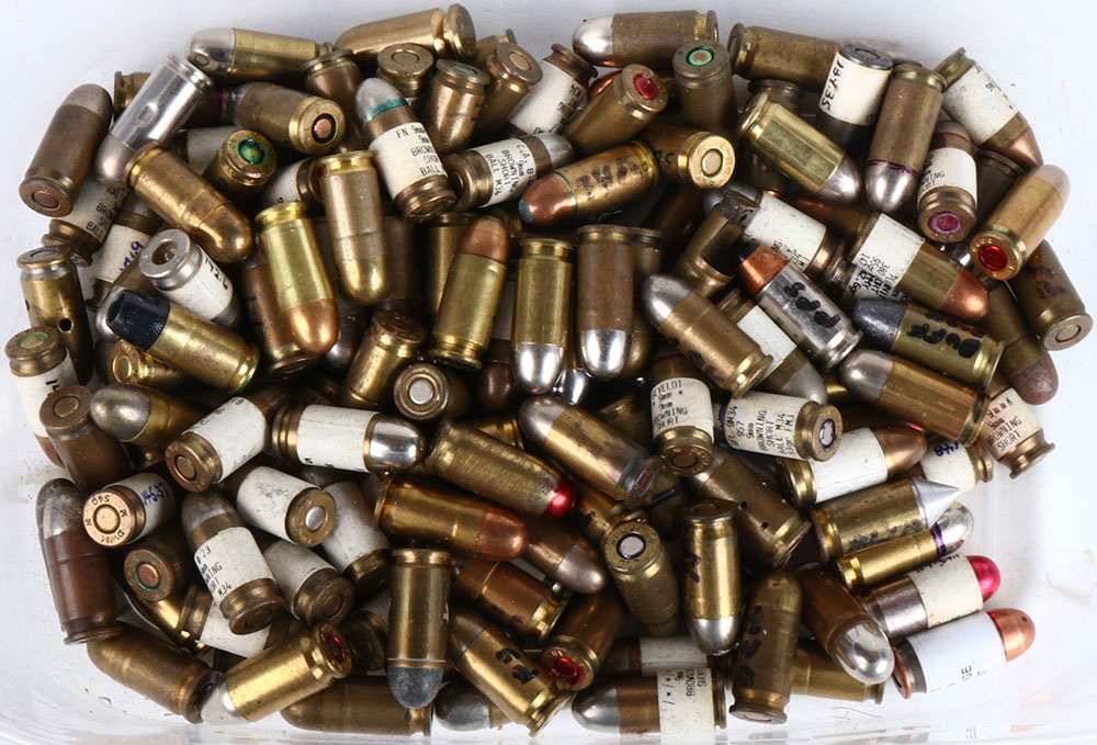 Lot of 150 ''9MM Browning'' all diff. H/S, PRI. & loads includes, SPL. Purpose loads, function dummies, TIN CS. Experimental, ECT. Grade: Excellent - Value: 60 to 100