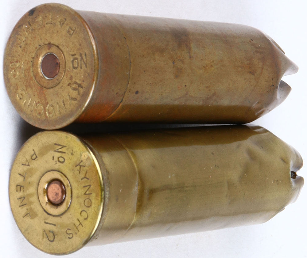 Lot of 2 H/S: ''KYNOCH No 12 Patent'' ''12 ga., loaded brass shotshell, 2 1/2'' OAL with crimp. Grade: Excellent - Value: 4 to 50