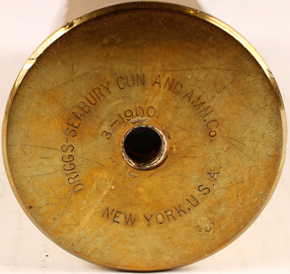 US, brass shell, inside measures 63mm, H/S: ''DRIGGS-SEABURY GUN AND AMM.CO.'', ''NEW YORK.U.S.A.'', ''3-1900'', OAL: 9 1/4''. Grade: excellent ++ - Value: 10 to 100