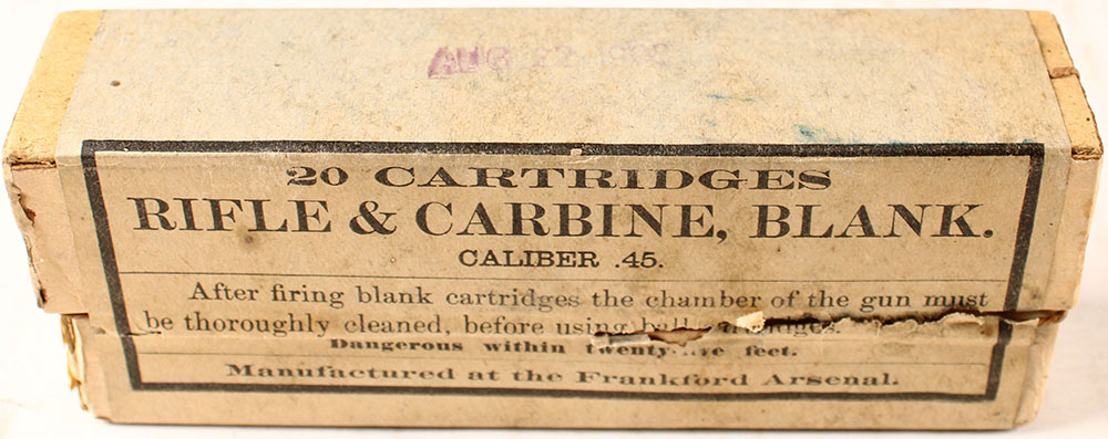 Frankford Arsenal, .45 Caliber Rifle & Carbine Blanks, top of box is stamped, ''AUG 22 1900'', 2pc, FULL & SEALED, buff box & label with black print, box is solid with light age soiling, tape on back seam, edge wear & rub wear. Grade: Very Good ++ - Value: 10 to 50