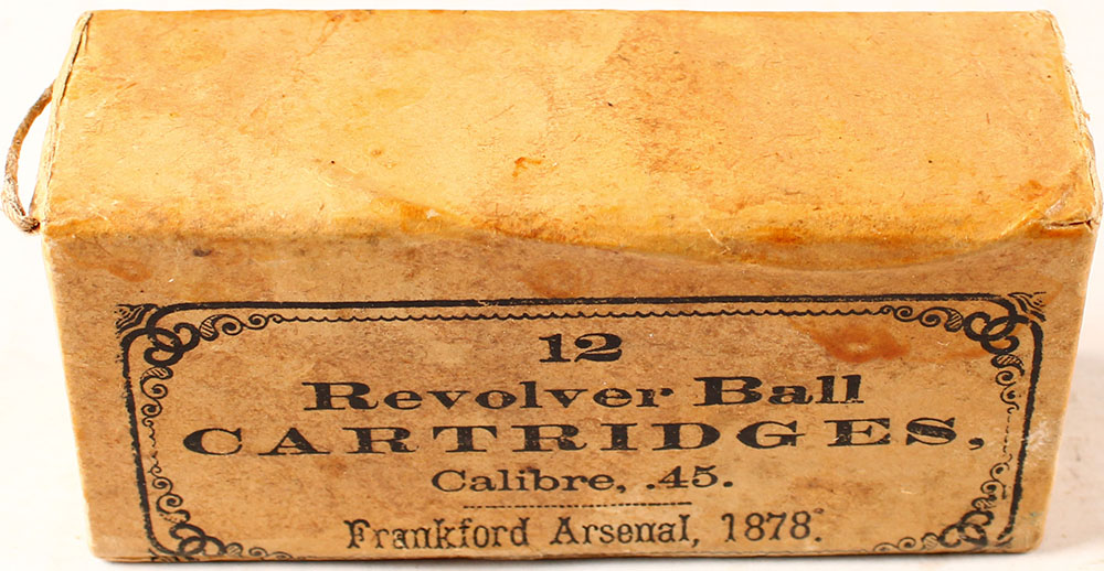 RARE!! Frankford Arsenal, .45 Revolver ball cartridges, 1878 dated, 1pc, FULL & SEALED, buff box with black print & lacquer coating, box is solid with light age soiling & light rub wear. Grade: Excellent - Value: 100 to 200