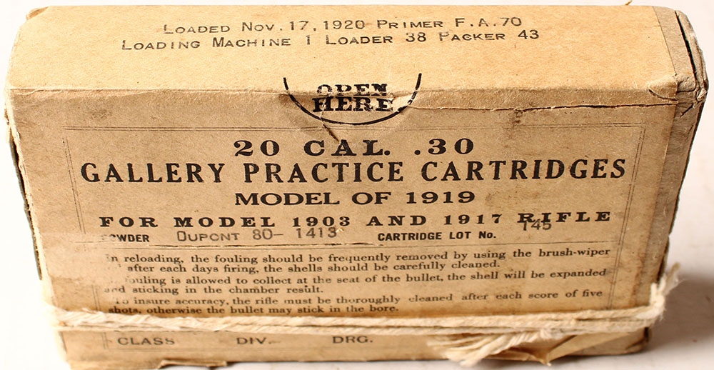 Frankford Arsenal, .30 Gallery Practice model 1919, 1pc, FULL & SEALED, buff box & label with black print, box is solid with rub marks, light edge wear, & light age soiling. Grade: Very Good ++ - Value: 20 to 40