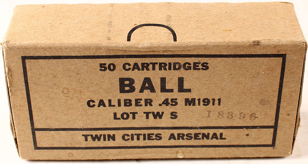 Twin Cities, .45 M1911 Ball, 1pc, Full, brown box with black print, box is solid with light age soiling & stains, ammo is very good. Grade: Excellent - Value: 20 to 40