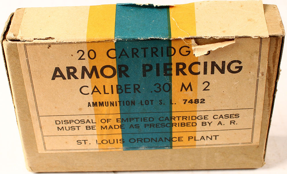 ST. Louis, .30 M2 Armor Piercing, Lot S. L. 7482, 1pc, Full & partially sealed, buff box with buff/orange/blue label & black print, box is solid with top seals almost torn all the way light age soiling, light rub marks & light edge wear, ammo is very good. Grade: Excellent - Value: 30 to 90