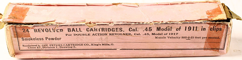 Peters, .45 Revolver Ball Cartridges model of 1911 in clips, 2pc, Full, buff box with pink label & black print, top seal has been completely torn, tape marks, faint stamp on bottom of box, light age soiling, pen marks, handling wear & rub wear, ammo is fair. Grade: Very Good + - Value: 50 to 250