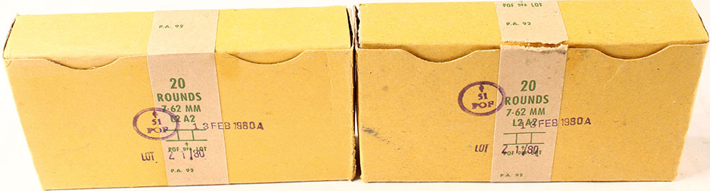 Lot of two, DPA, 7.62mm L2 A2, 1980 dated, 1pc, Both Full, yellow box with buff label & green print, box's are solid with light rub wear, ammo is very good. Grade: Excellent - Value: 30 to 90