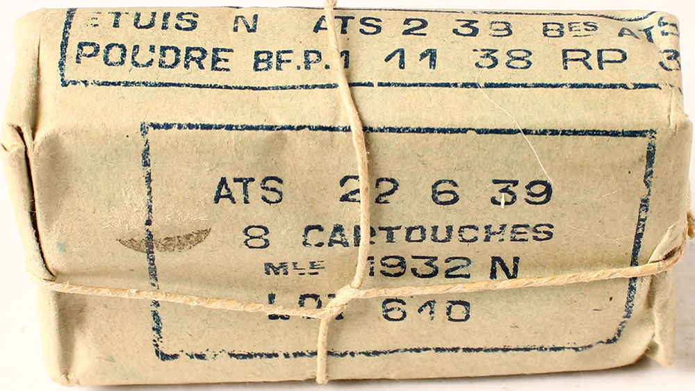 French ATS, 8mm Lebel, MLE 1932 N, wrap, FULL & SEALED, green wrap with blue print, wrap is solid with light rub wear. (958) Grade: Excellent + - Value: 10 to 40