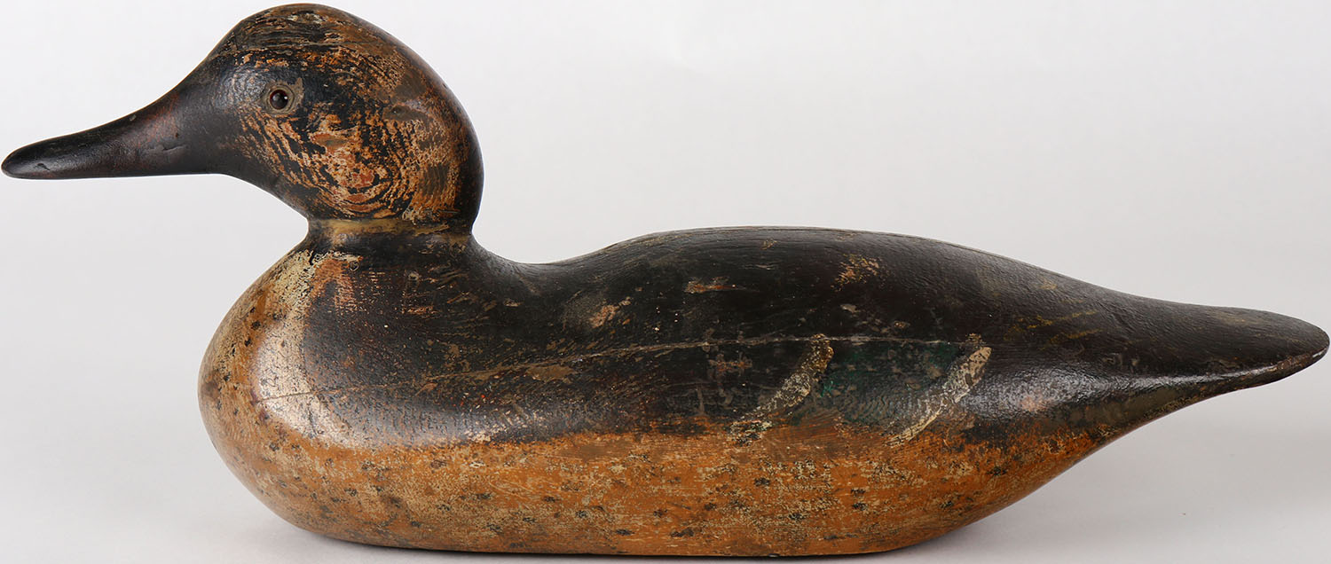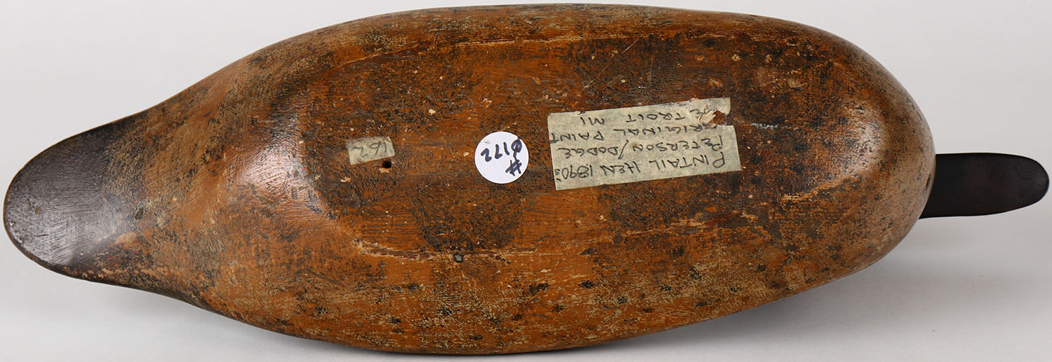 Pintail Hen by Mason Decoy Company, Detroit, MI,1896-1924 standard grade, glass eyes, solid wood, has age cracks in back, original paint. Grade: Very Good + - Value: 150 to 300