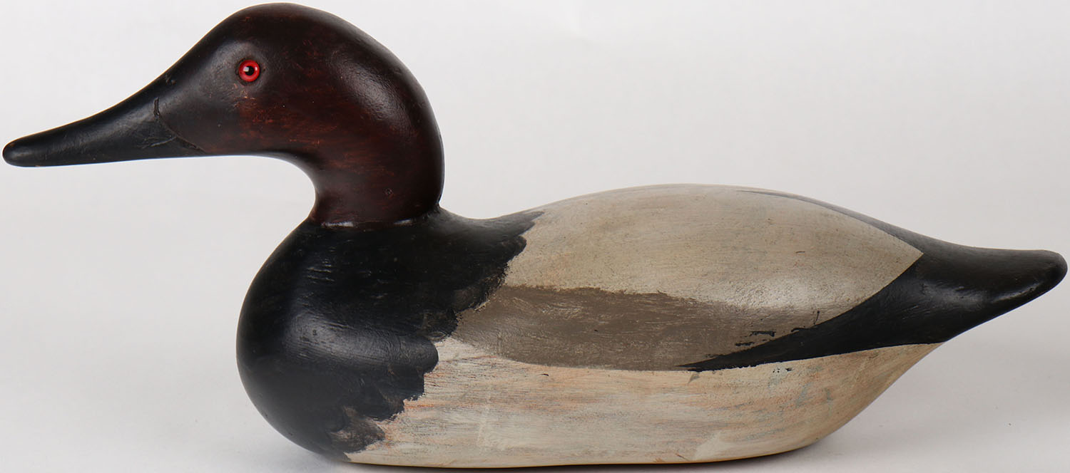 Canvasback Drake by Mason Decoy Company, Detroit, MI, 1896-1924 standard grade, glass eyes, solid wood, structurally excellent, appears to be repainted. Grade: Excellent + - Value: 50 to 150