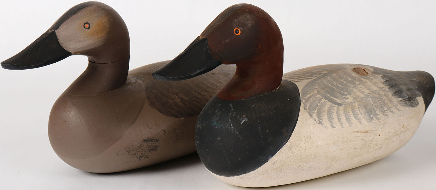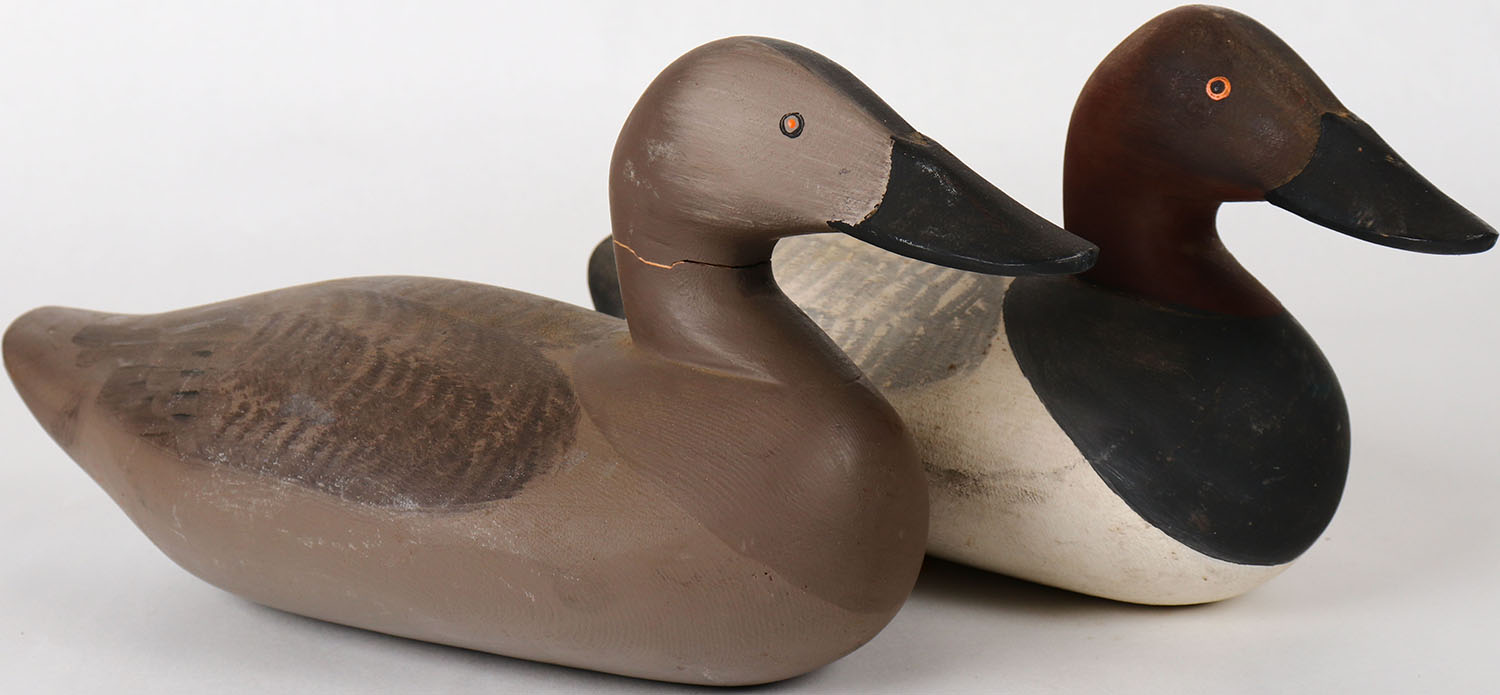 Pair of Canvasbacks by Paul Gibson, Havre de Grace, MD, painted eyes, solid wood, structurally excellent, signed on bottom, original paint. Grade: Excellent ++ - Value: 80 to 300