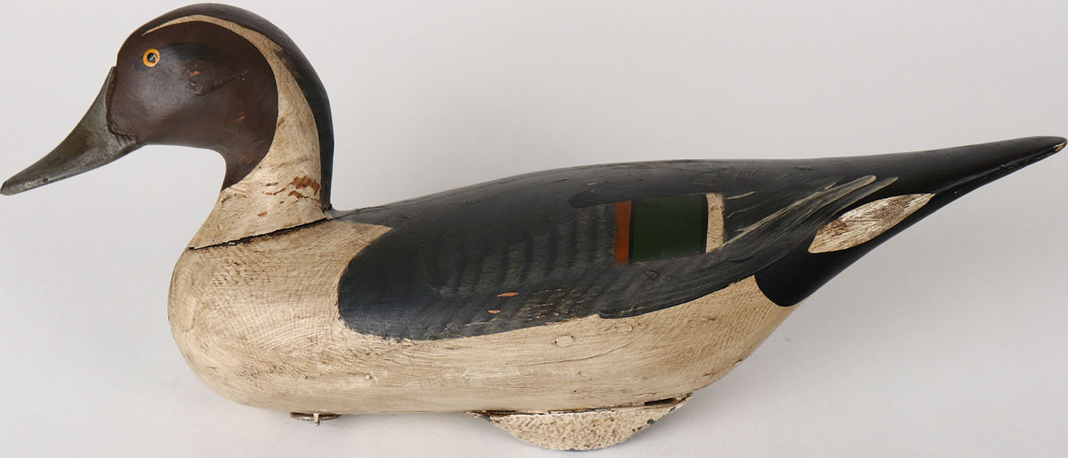 Pintail Drake by unknown maker, Havre de Grace, MD, painted eyes, solid wood, has age cracks on bottom and around neck, original paint. Grade: Very Good ++ - Value: 100 to 200