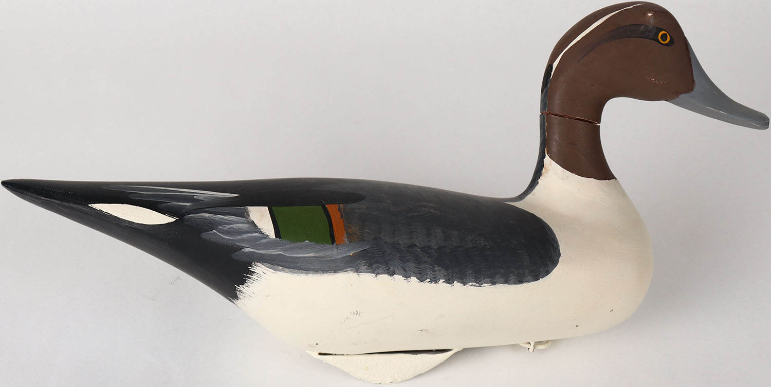 Pintail Drake by Capt. Harry Jobes Havre de Grace, MD, painted eyes, solid wood, has age crack around neck, original paint. Grade: Very Good ++ - Value: 70 to 200