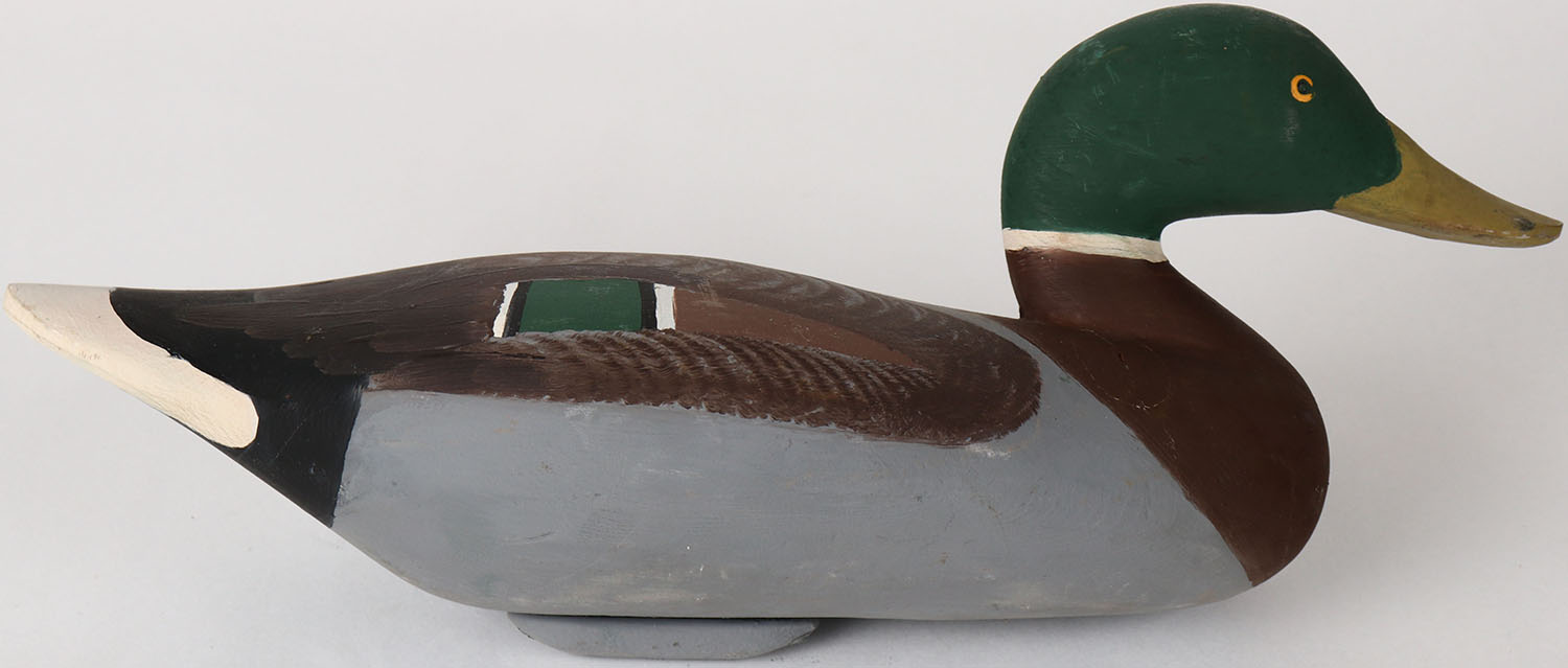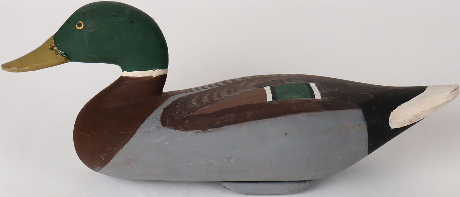 Mallard Drake by unknown maker, MD, painted eyes, solid wood, structurally excellent, branded and signed on bottom, original paint. Grade: Excellent + - Value: 50 to 100
