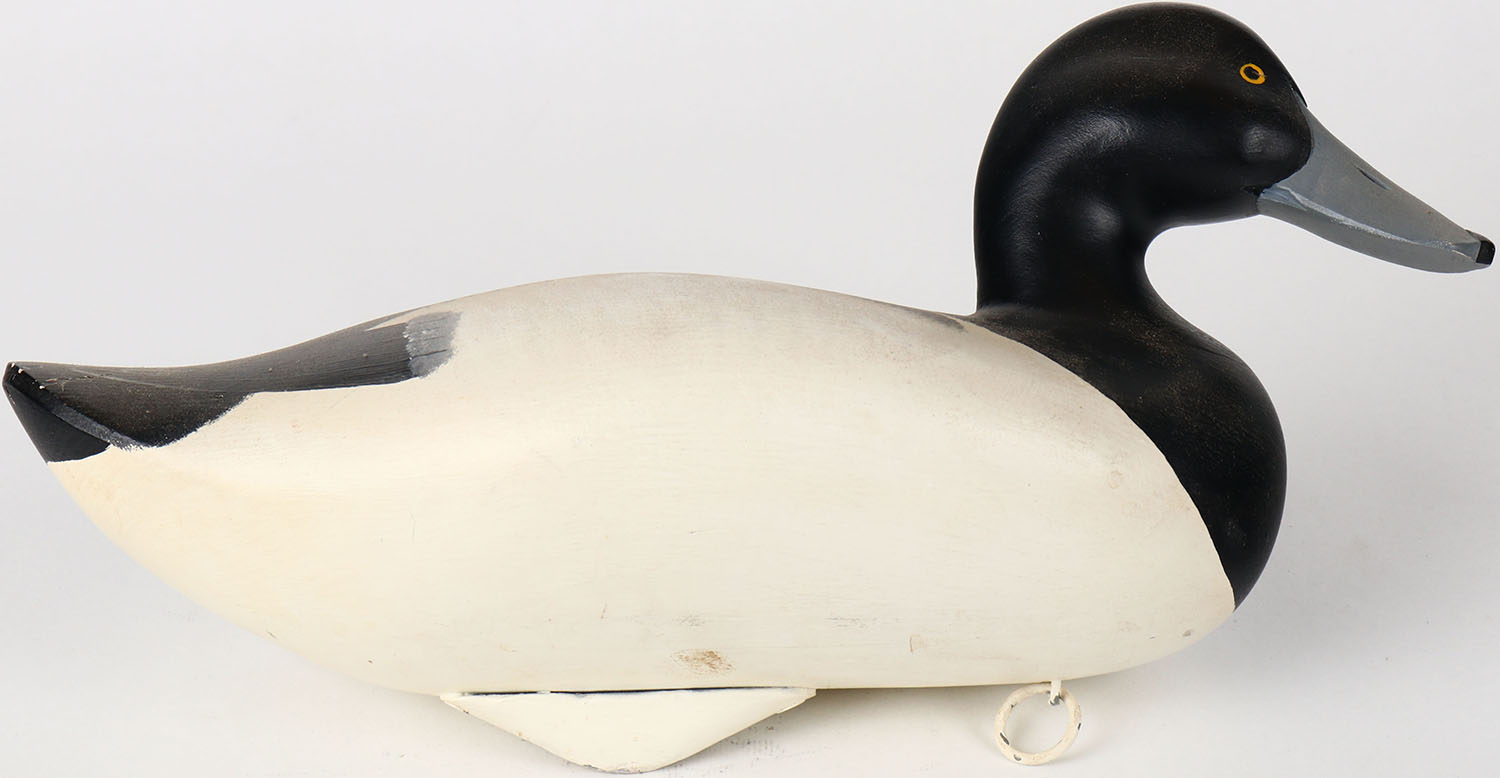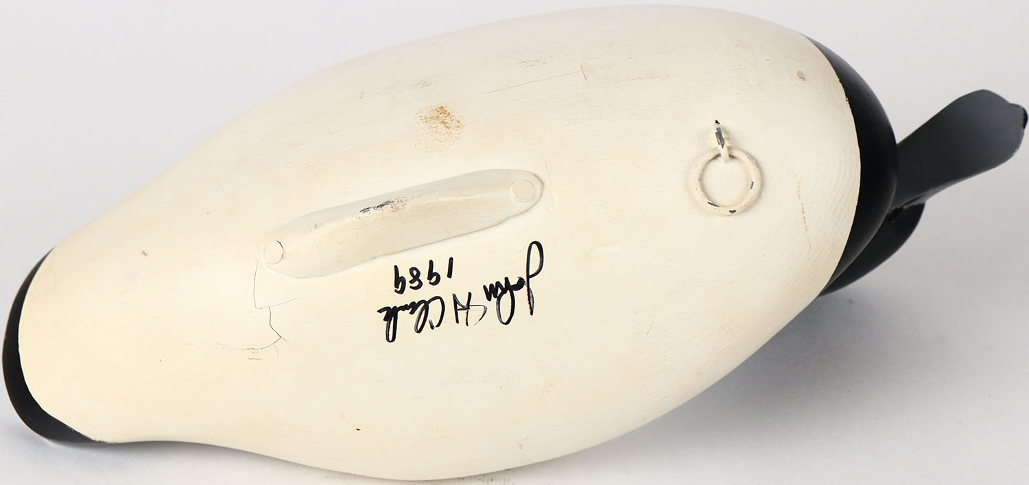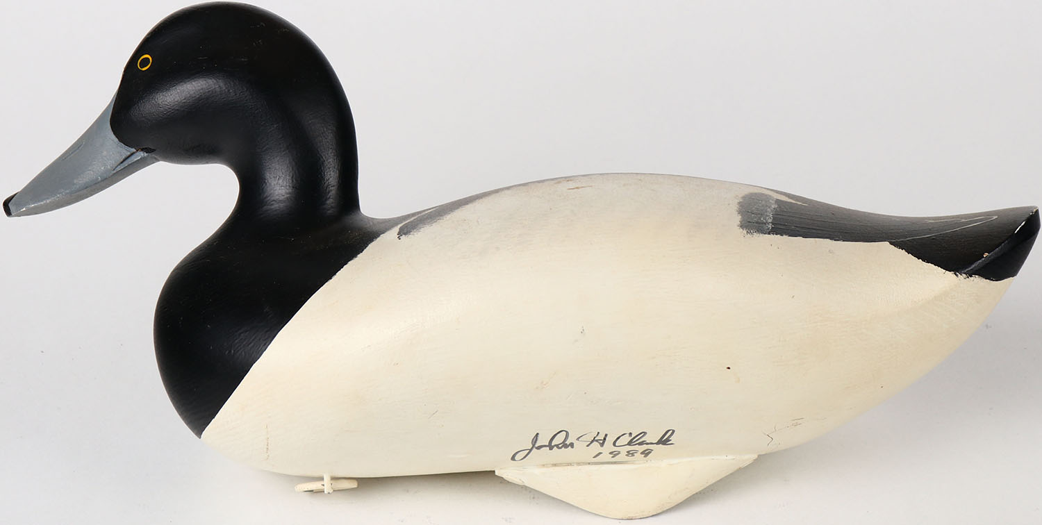 Bluebill Drake by John H Clark, (1989), Havre de Grace, MD, painted eyes, solid wood, structurally excellent, signed on bottom, original paint. Grade: MINT - Value: 50 to 150