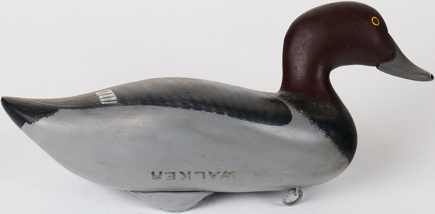 Redhead Drake by Dave Walker Havre de Grace, MD, painted eyes, solid wood, structurally excellent, branded WALKER on bottom, original paint. Grade: Excellent + - Value: 50 to 150