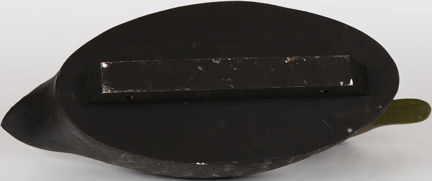 Black Duck by Barnegat Bay Decoys, Barnegat Bay, NJ, glass eyes, solid wood, structurally excellent, branded on bottom, original paint. Grade: Excellent ++ - Value: 70 to 150
