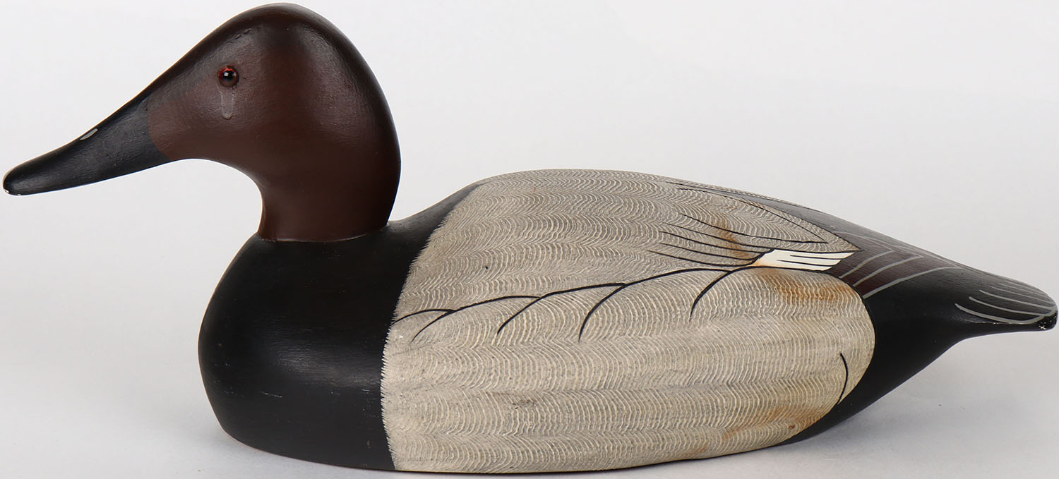 Canvasback Drake by Wildfowler Decoys, glass eyes, solid wood, structurally excellent, branded by WILDFOWLER DECOYS on bottom, original paint with comb painting. Grade: MINT - Value: 30 to 60