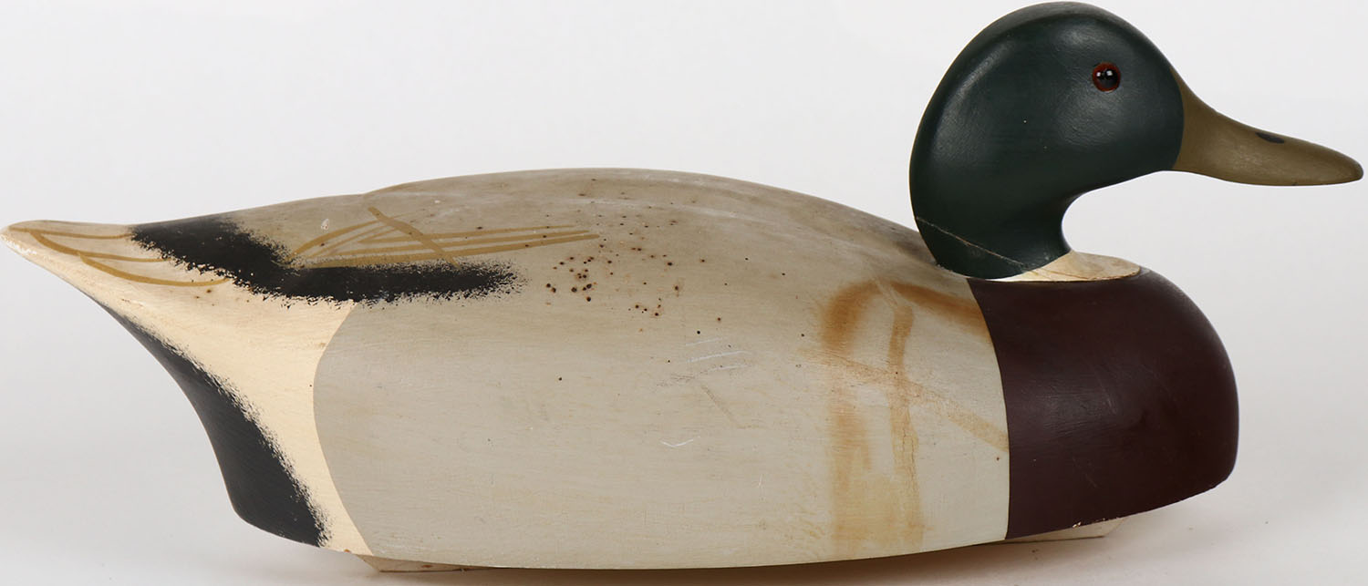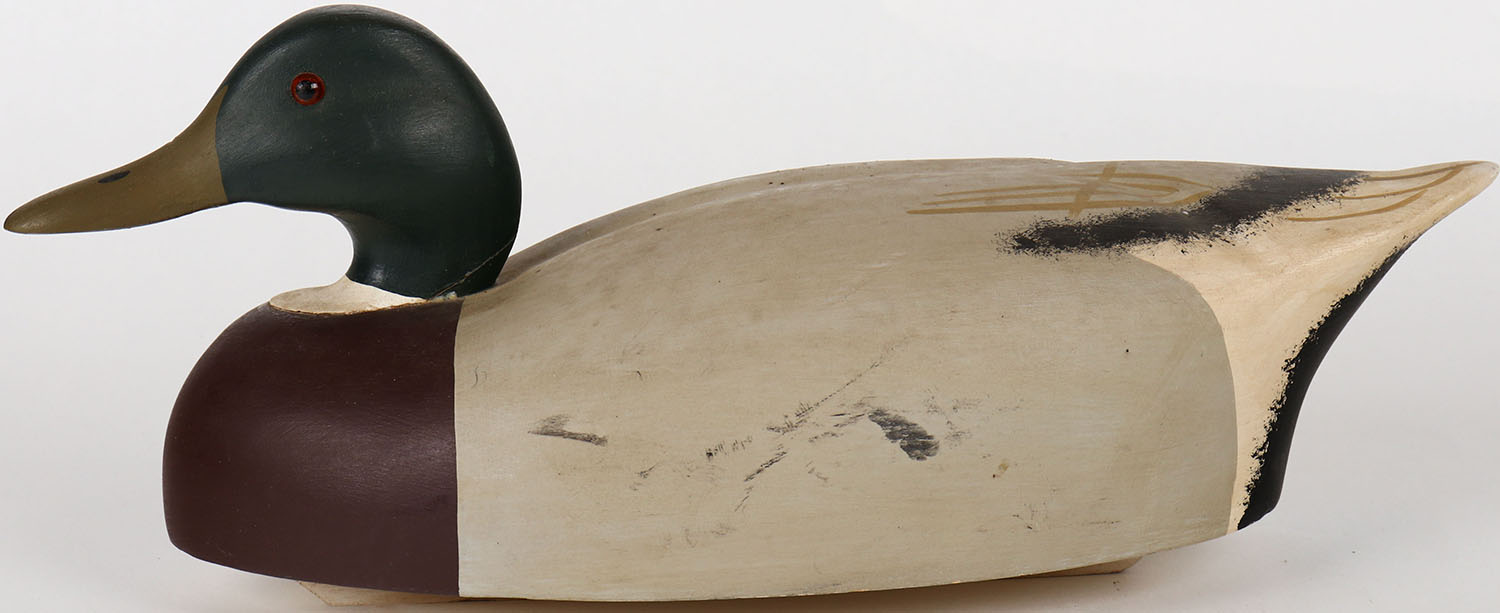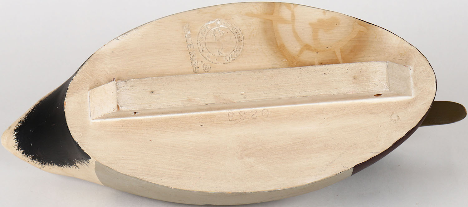 Mallard Drake by Wildfowler Decoys, Babylon, N.Y. glass eyes, solid wood, has age crack on back of head, branded on bottom, original paint. Grade: Very Good ++ - Value: 50 to 100