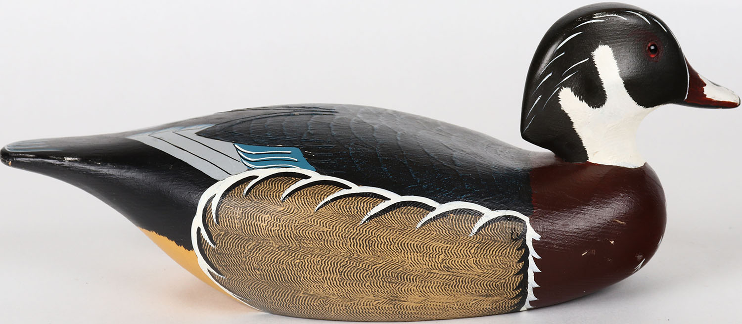 Wood Duck Drake by Wildfowler Decoys, Babylon, N.Y, glass eyes, solid wood, structurally excellent, stamped and signed on bottom, original paint with comb painting. Grade: MINT - Value: 40 to 80