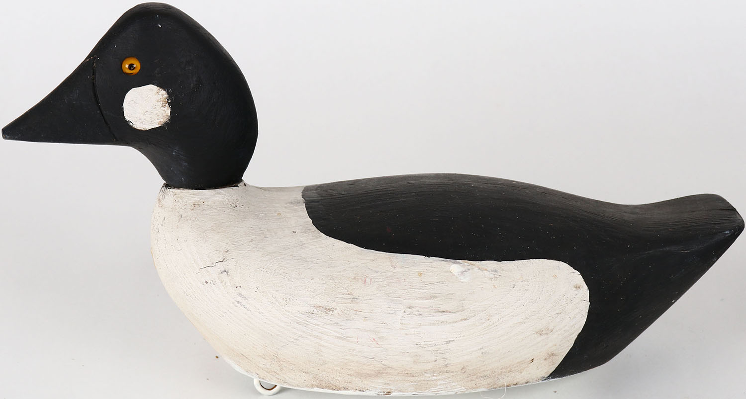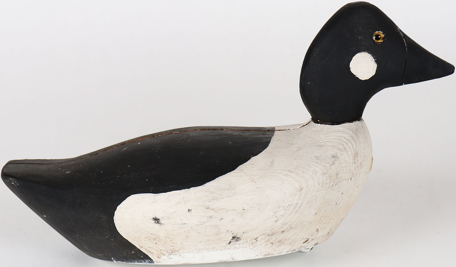 Goldeneye Drake by unknown maker, glass eyes, solid wood, structurally excellent, repainted. Grade: Very Good ++ - Value: 30 to 60