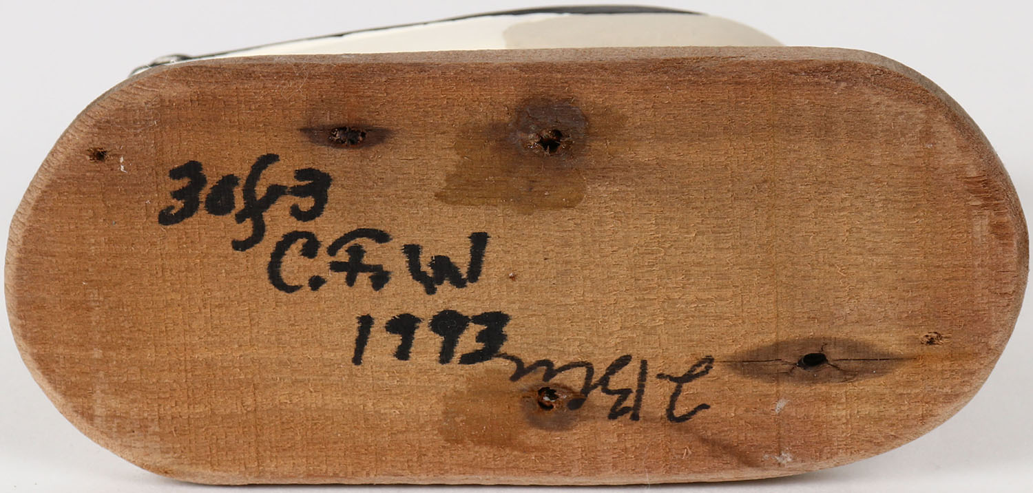 Standing Canada Goose by C.F.W. on wood stand, glass eyes, solid wood, structurally excellent, signed on bottom, original paint. Grade: MINT - Value: 20 to 40