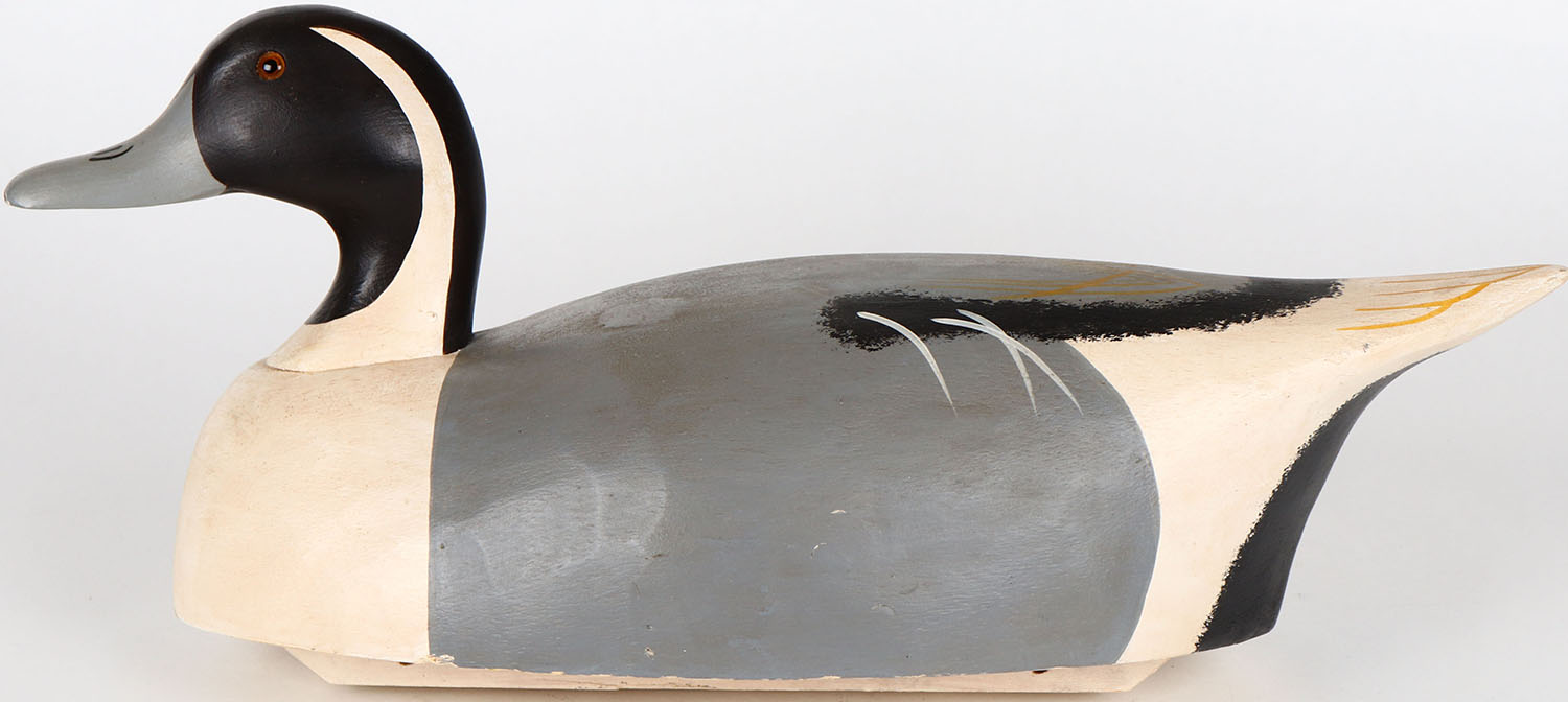 Pintail Drake by Wildfowler Decoys, Babylon, N.Y. glass eyes, hollow wood, structurally excellent, branded on bottom, original paint. Grade: MINT - Value: 50 to 150