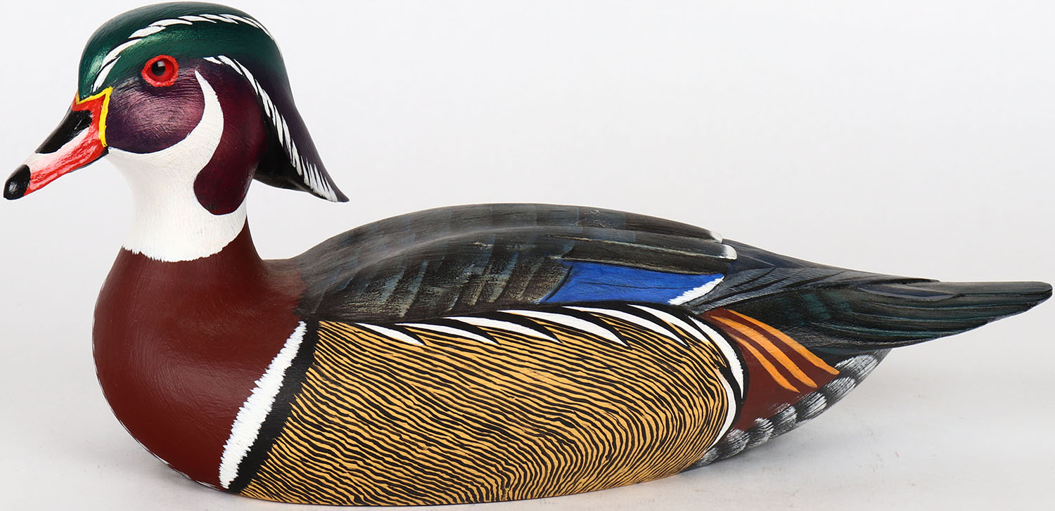 Wood Duck Drake by Joe Freitas, glass eyes, solid wood, structurally excellent, signed on bottom, original paint. Grade: MINT - Value: 100 to 200