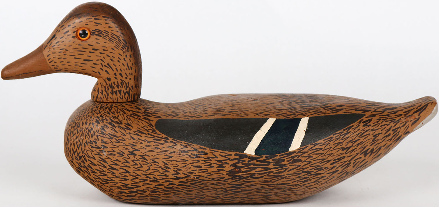 Mallard Hen by unknown maker, WI?, glass eyes, solid wood, head comes off, original paint. Grade: Excellent ++ - Value: 150 to 300
