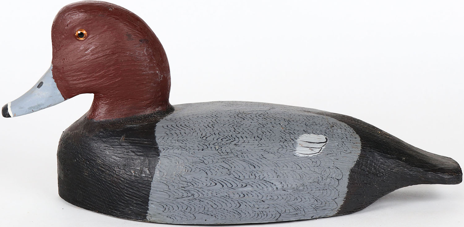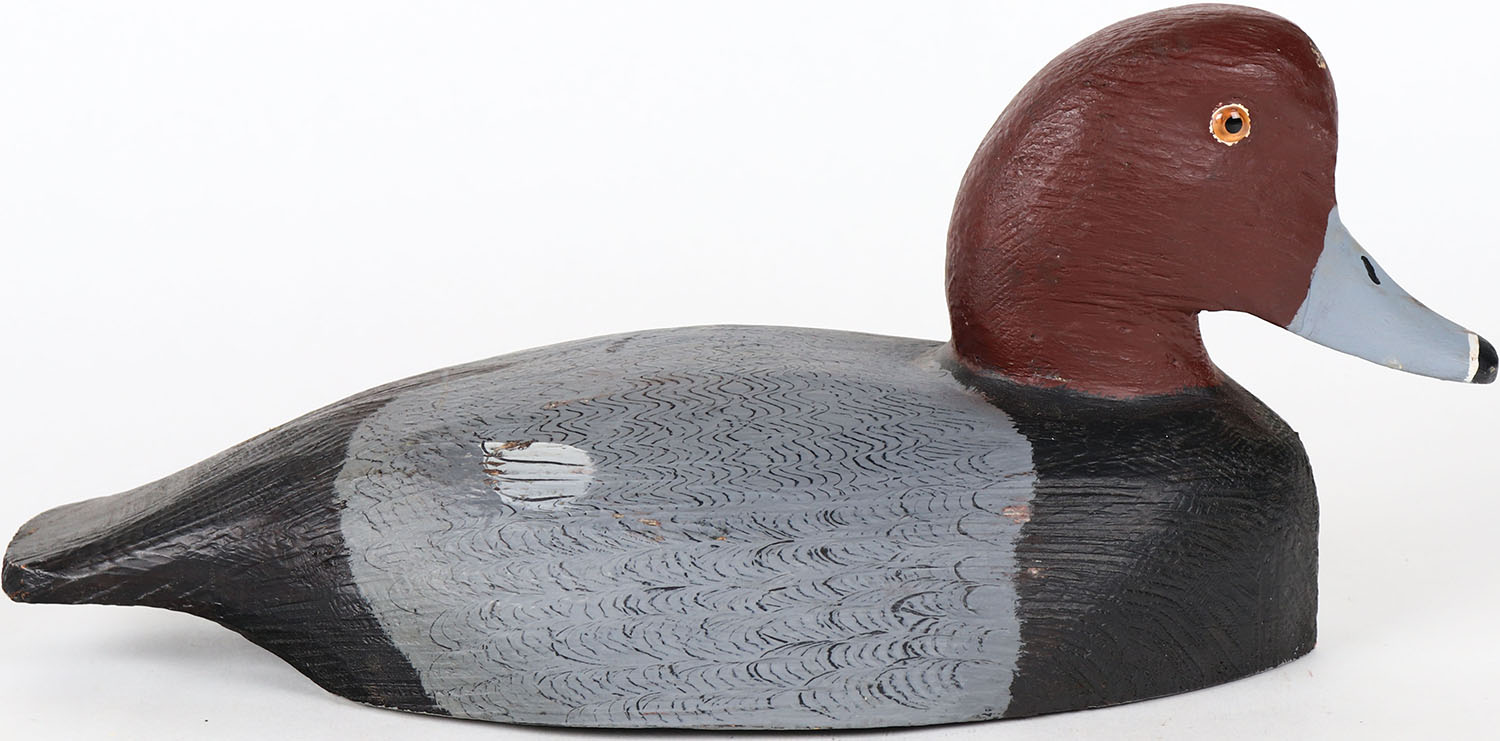 Redhead Drake by Tom Martindale, Ontario, Canada, glass eyes, solid wood, structurally excellent, signed on bottom, original paint. Grade: MINT - Value: 50 to 100