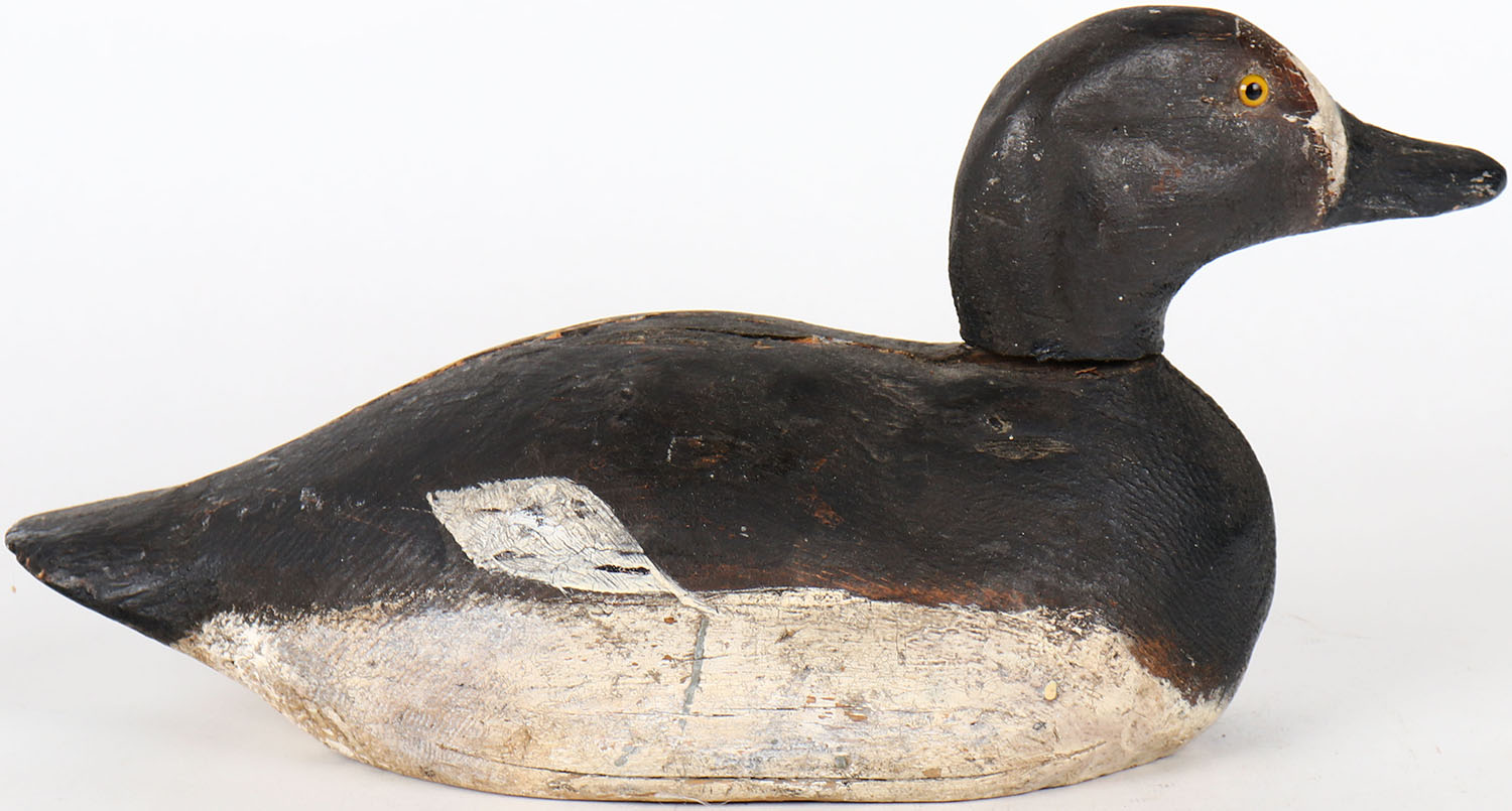 Bluebill Drake by unknown maker, glass eyes, solid wood, head is loose, has age crack on back and side, original paint. Grade: Very Good + - Value: 40 to 80
