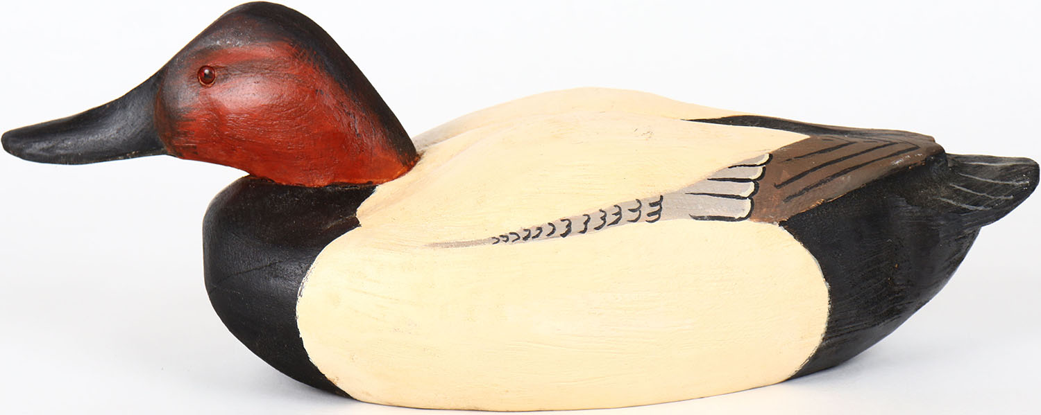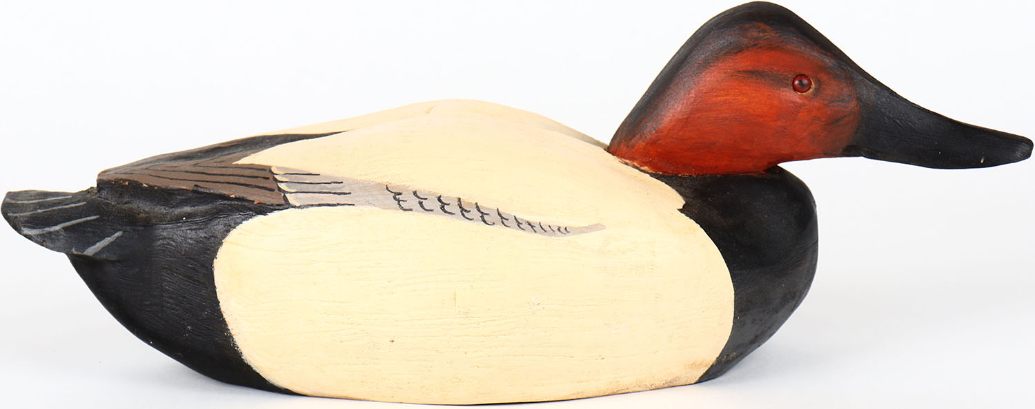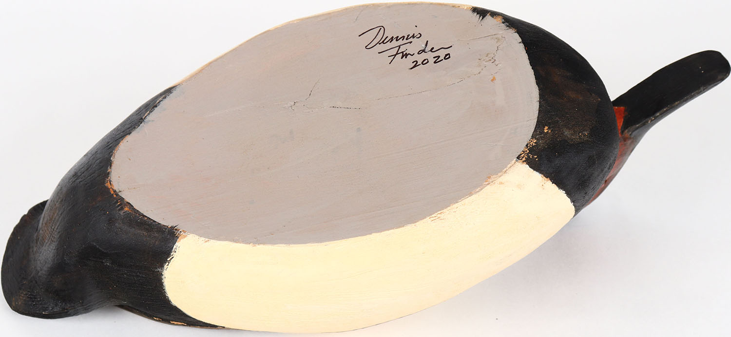 Canvasback Drake by Dennis Finde, glass eyes, solid wood, structurally excellent, signed on bottom, original paint. Grade: MINT - Value: 50 to 100