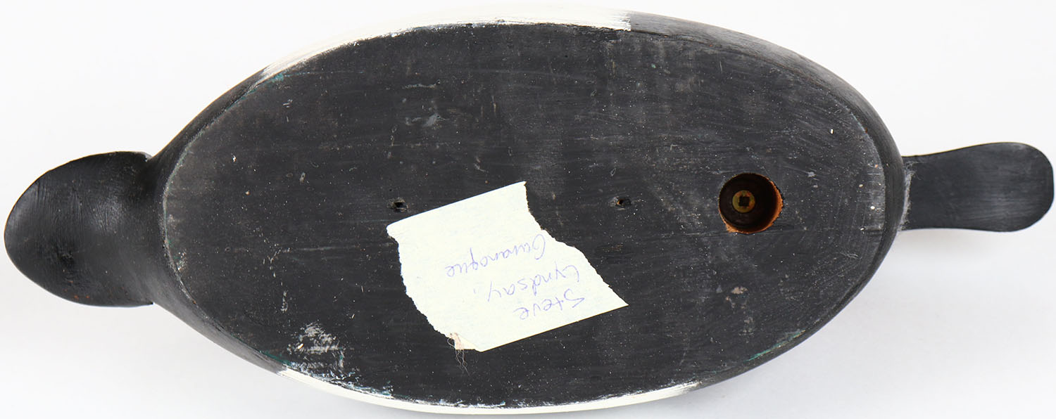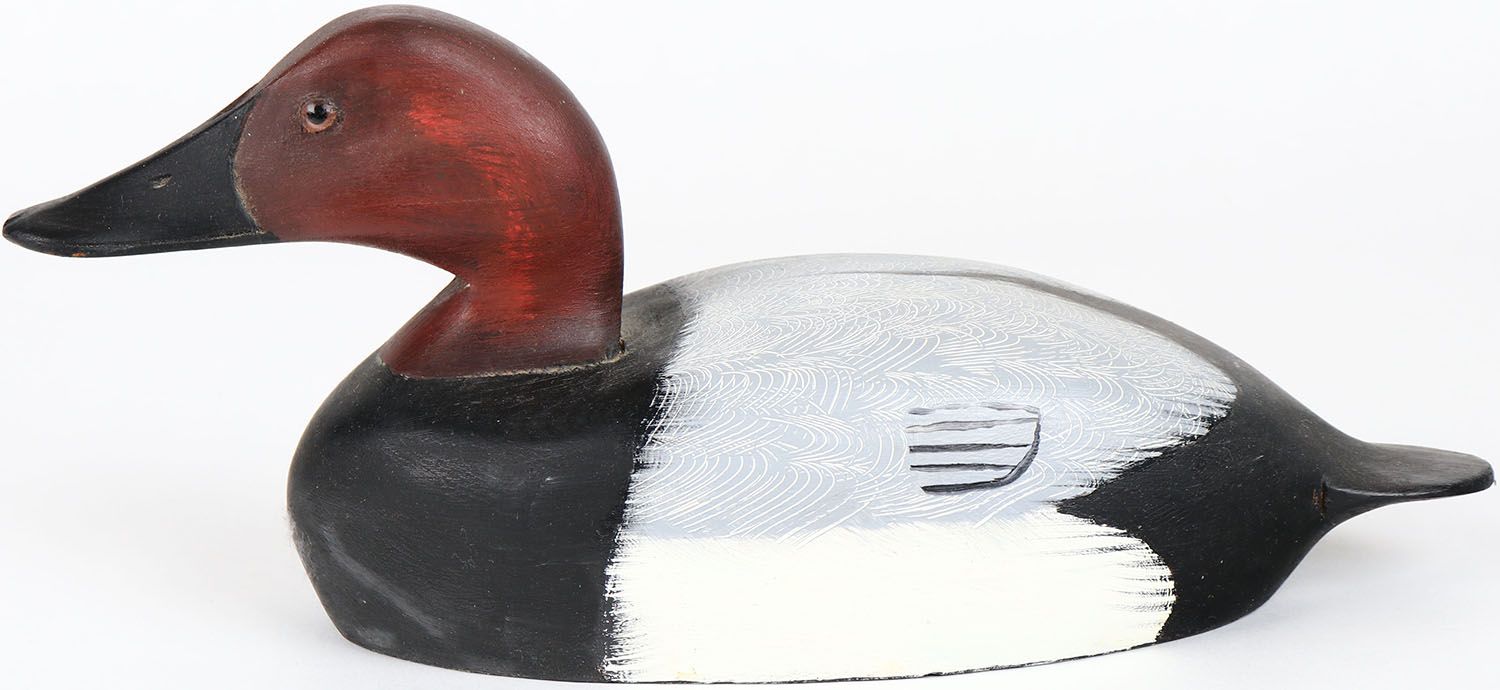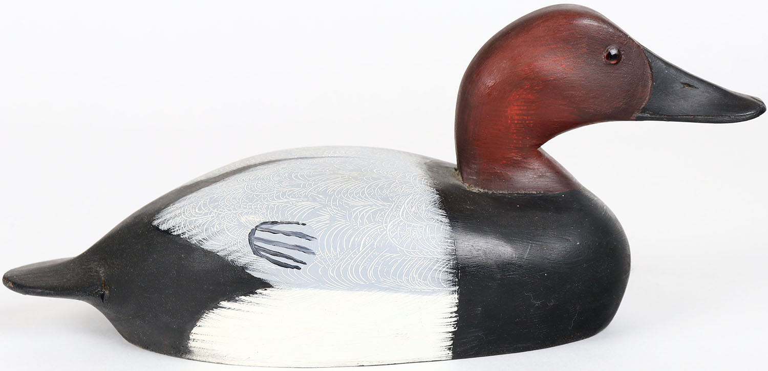 Canvasback Drake by Steve Lyndsay, Gananoque, ONT, glass eyes, solid wood, structurally excellent, signed on bottom, original paint with comb painting. Grade: MINT - Value: 50 to 100