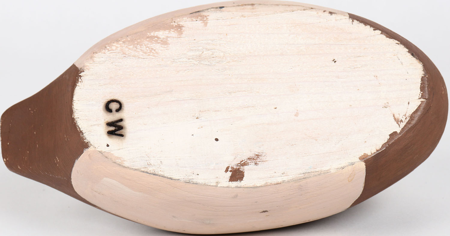 Sleeping Canvasback Hen by CW, glass eyes, hollow wood, structurally excellent, branded CW on bottom, original paint. Grade: MINT - Value: 30 to 60