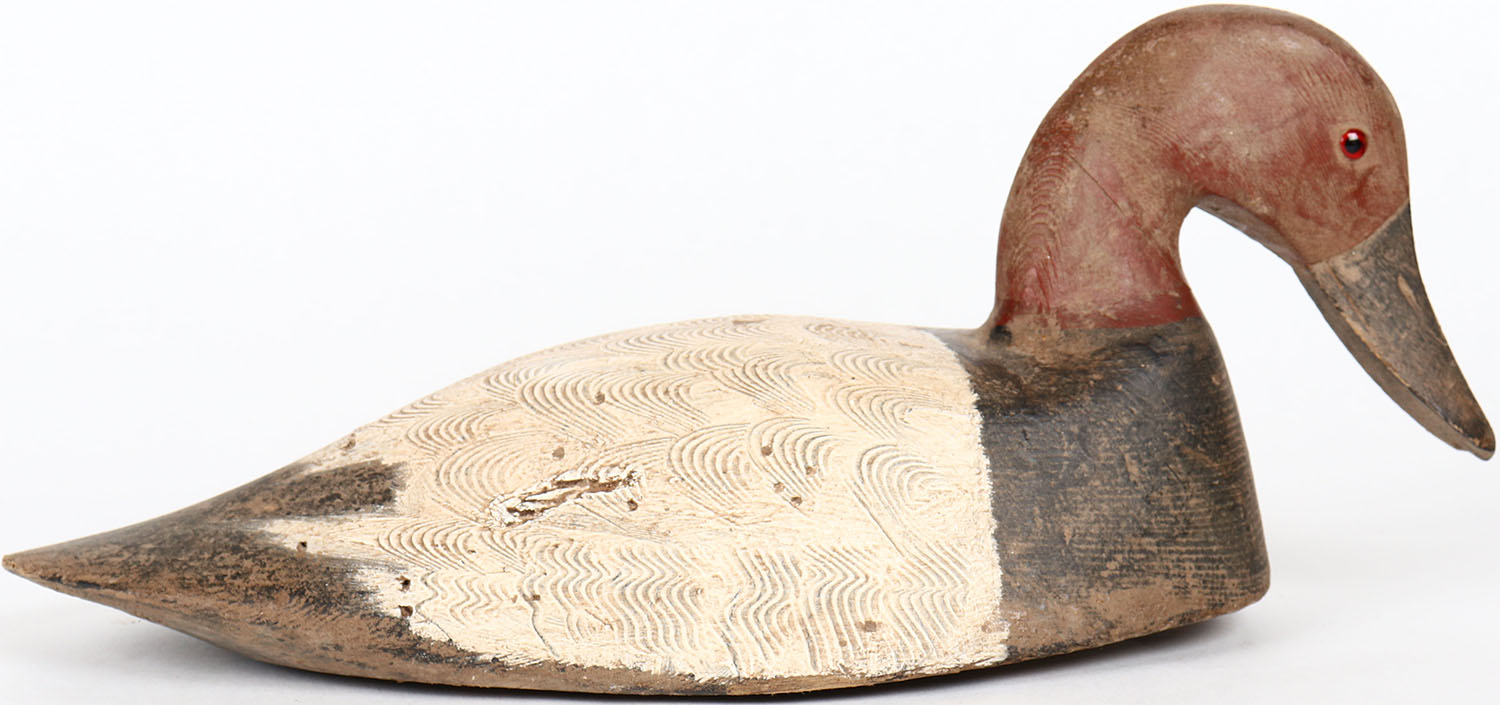 Canvasback Drake by unknown maker, glass eyes, solid wood, structurally excellent, original paint with comb painting. Grade: MINT - Value: 40 to 80