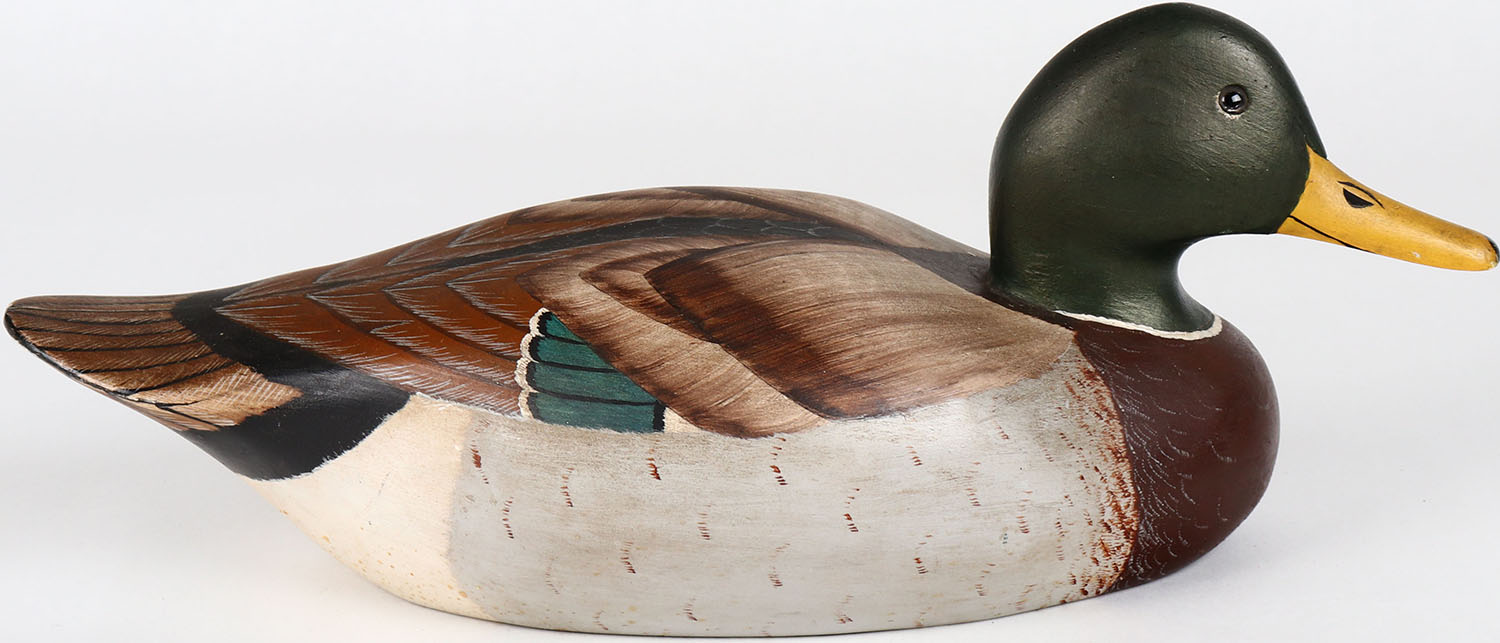 Mallard Drake by unknown maker, Glen Burnie MD. glass eyes, solid wood, structurally excellent, branded on bottom, original paint. Grade: MINT - Value: 40 to 80