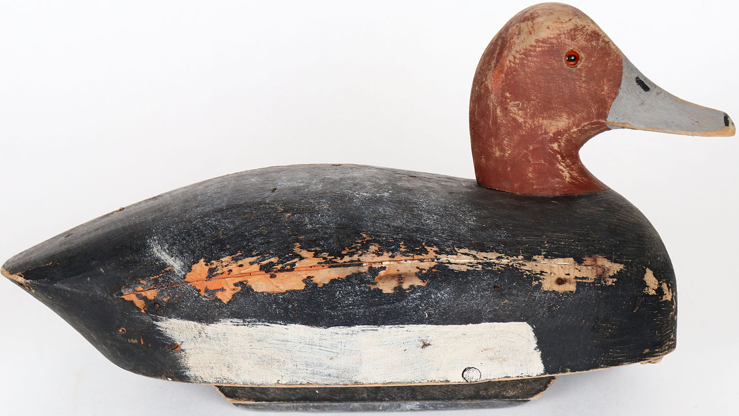 Redhead Drake by unknown maker, glass eyes, solid wood, has age crack on back and side, original paint. Grade: Very Good ++ - Value: 30 to 60