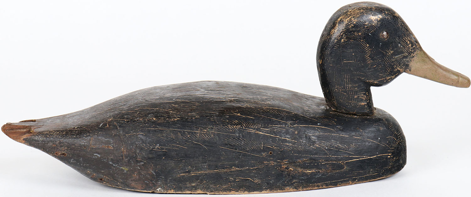 Black Duck by unknown maker, tack eyes, solid wood, structurally excellent, original paint. Grade: Very Good ++ - Value: 40 to 80