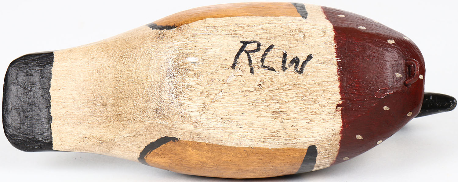Wood Duck Drake by RLW, glass eyes, solid wood, structurally excellent, branded RLW on bottom, original paint. Grade: Excellent + - Value: 40 to 80